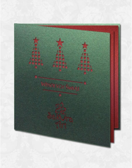 Oryginalna kartka świąteczna z trzema CHOINKAMI oraz napisem "Wesołych Świąt" na okładce.