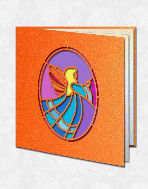 Prestiżowa kartka-witraż świąteczny z ANIOŁKIEM na środku okładki.