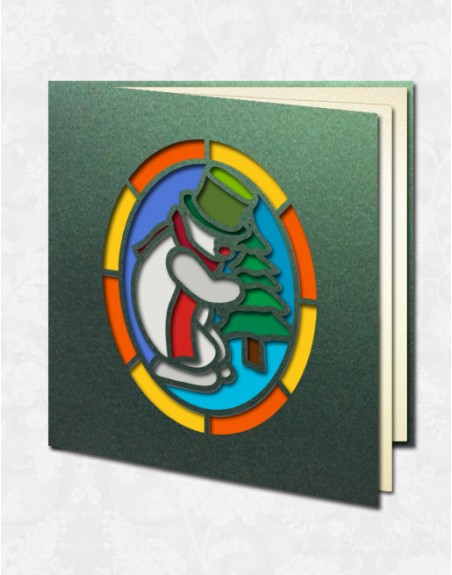 Prestiżowa kartka-witraż świąteczny z BAŁWANKIEM na środku okładki.