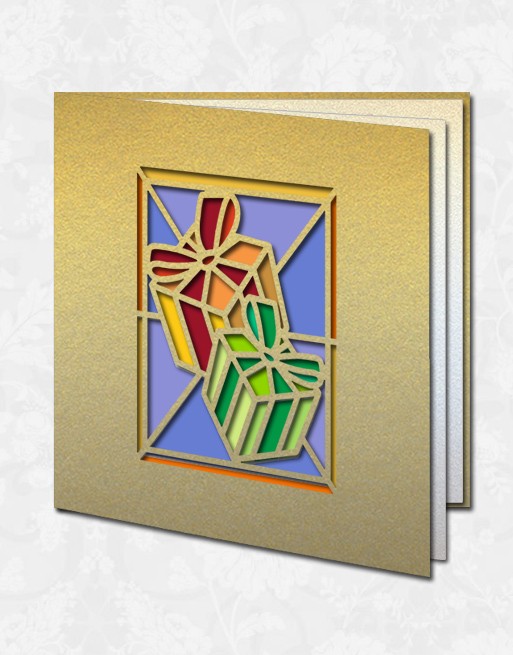Prestiżowa kartka-witraż świąteczny z PREZENTAMI na środku okładki.